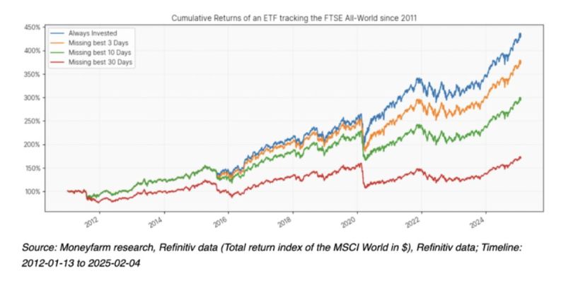 Timing the market is notoriously difficult; even missing just a few of the best days can make a significant difference to overall performance, as illustrated in the chart below.