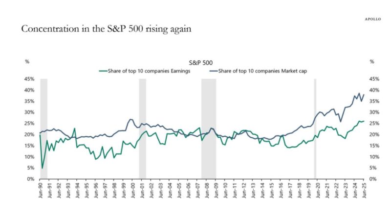 As for concentration risk, that’s only got worse in the last few months. According to Apollo’s Chief Economist Torsten Slok, the concentration in the S&P 500 has returned to extreme levels, with the top 10 companies accounting for 40% of the index’s market capitalisation and a record-high share of earnings. He cites the chart below, which shows a consistent upward trend in recent months. According to Slok, “the extreme index concentration in tech is obviously not good for investors seeking to diversify their investments across 500 different companies. Anyone investing in the S&P 500 index today is basically making a bet on the Magnificent 7 stocks propelling even higher.”