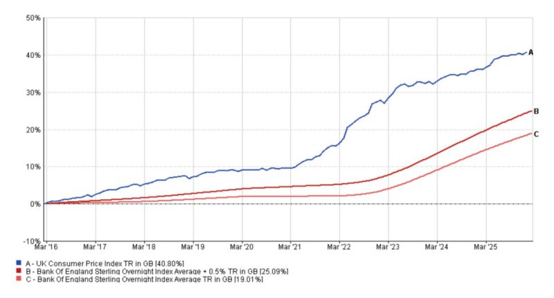 What’s visibly clear here, is that savings rates have not matched inflation over the last 10 years. Even those who have shopped around and switched providers to find the best possible savings rates (line B) have not beaten inflation over the last 10 years. What’s perhaps most concerning is that CPI has increased by some 40% over the last 10 years. In other words, the average price for goods, services and housing costs has gone up by around 40% since February 2016. Had you been saving your money in a savings account which paid interest in line with SONIA, you’d have returned around 19%