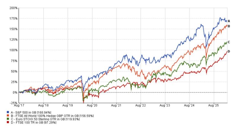 The chart below plots four major stock market indexes over the last 10 years. The S&P 500 (US shares), the FTSE All World (Global shares), the Euro Stoxx 50 (European shares) and the FTSE 100 (UK Shares). All are denoted in GBP to show rolling returns that UK investors might see, had they invested into these indexes via an index-fund. Each has performed differently, yet demonstrates shared trends in their overall performance; they slump and rally at similar points, but overall demonstrate an upward trajectory on average.