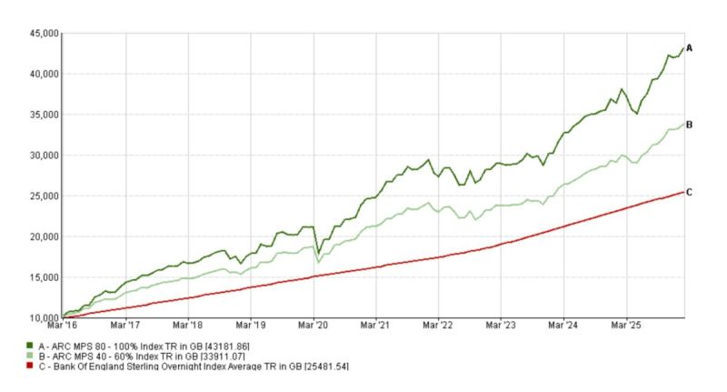 To simulate historical returns in a cash ISA, we will again use the SONIA in red – a key measure of interest rates as defined by the inter-bank borrowing rate. To simulate historical returns in a Stocks and Shares ISA, we’ll use the ARC 40-60% and ARC 80-100% composite benchmark indexes in green – to benchmark the average returns of a balanced and adventurous discretionarily managed portfolio in the UK.
