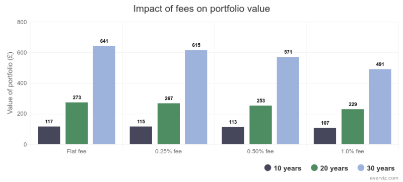 Basis of calculations: initial investment of £50,000 with an annual growth rate of 9%. Flat platform fee of £100 in year one, growing by 5% thereafter