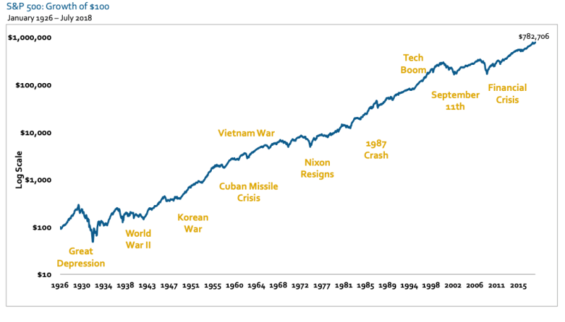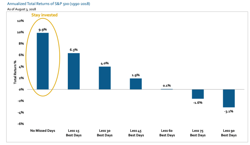 The chart shows results from investments in the S&P500 between 1990-2018, they found that investors who missed only the 15 best days in the market during the period had an annualised return of more than a third less than those who remained investors. Shockingly, investors who missed out on the 90 best days actually faced a negative 3.1% annual average return. Think about that: three decades of ‘waiting for the dip’ resulted in having less money than you started with, while those who ignored the noise built significant wealth.