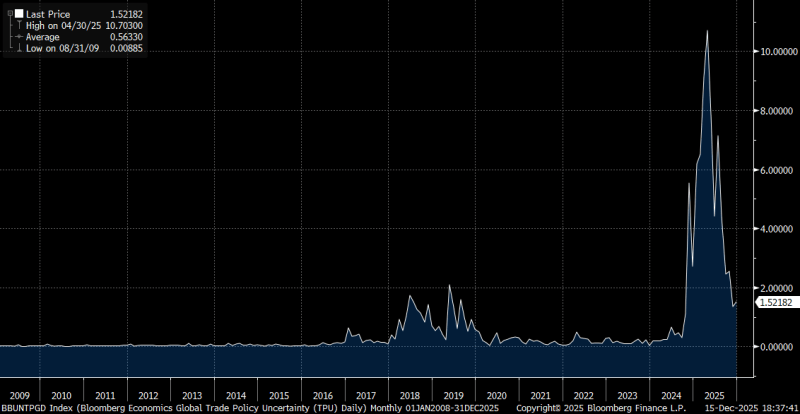 The chart below shows Bloomberg’s Trade Policy Uncertainty Index, highlighting the start of a new regime following Trump’s election.