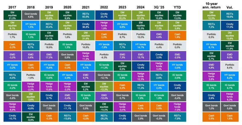 The chart below shows euro-denominated returns across different asset classes and a 60/40 portfolio. As highlighted in the two columns on the right, over the past ten years this type of portfolio delivered the third-highest return while ranking sixth in terms of risk, illustrating the value of diversification.