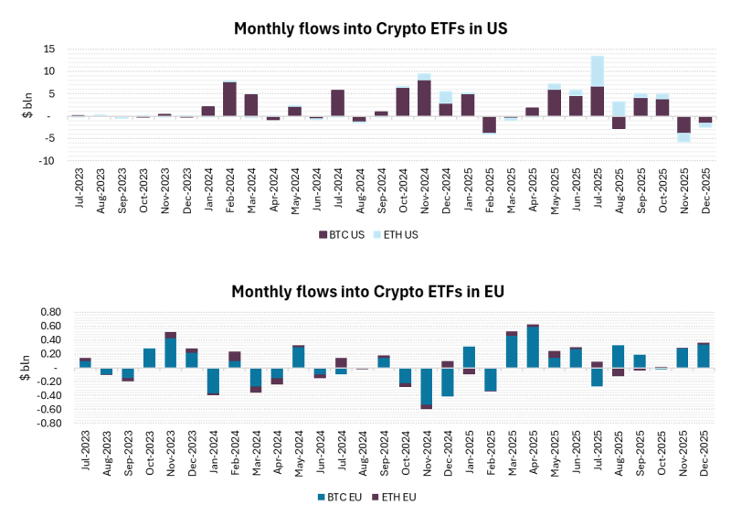 The most significant directional trend observed was a persistent, albeit moderating, withdrawal of capital from US-listed crypto products. This marks the second consecutive month where the US market has registered net outflows.