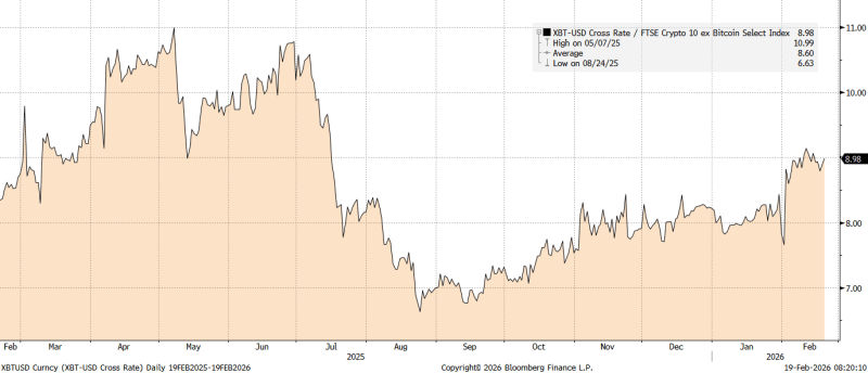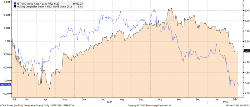 Institutional investors are shifting away from technology stocks, signalling a significant rotation in financial markets. Sentiment in the software industry remains weak, as institutional players increasingly focus on “real economy” assets, such as energy and materials. This rotation is happening as the disruptive influence of Artificial Intelligence (AI) takes a toll on what were previously considered businesses with strong competitive moats, with key charts highlighted in the crypto industry this month illustrating this trend. The tech-heavy Nasdaq is currently underperforming global equities, with the US market experiencing one of its worst starts to the year compared to other equity indexes.