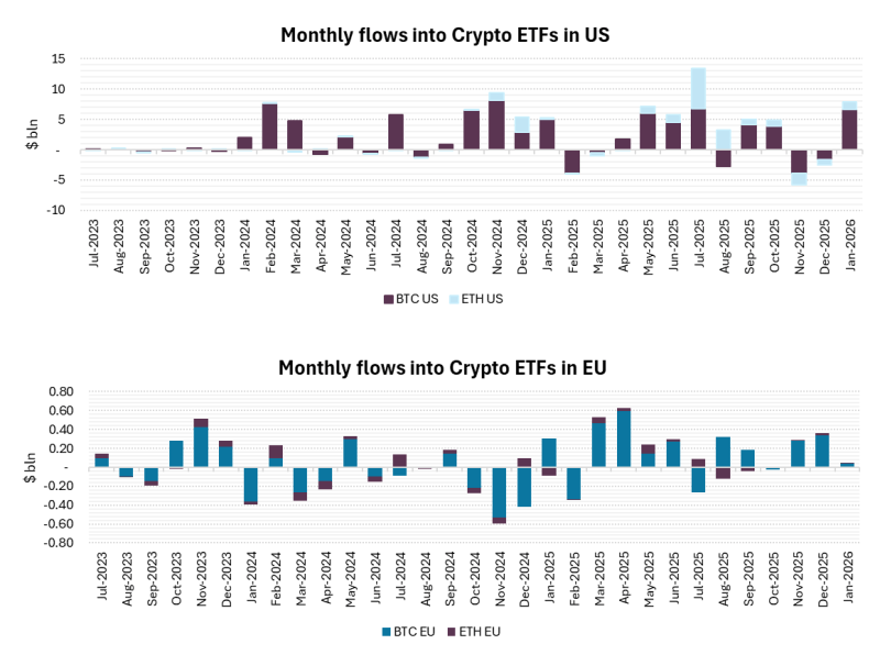 The European market, however, remains marginal. Tracked Bitcoin ETP AUM decreased from $9.1 billion at the end of December to $8.7 billion. Adjusting for the impact of performance, this still implies very marginal buying activity persisted in the European space.