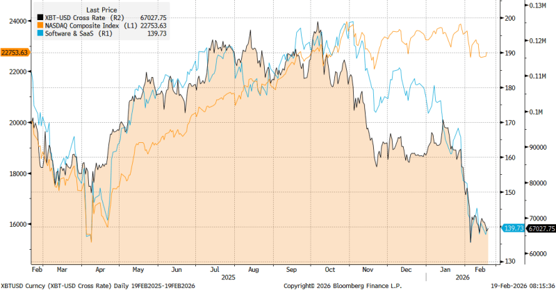 As the disruptive wave of AI continues, investors are growing cautious of legacy software companies, and Bitcoin appears to have been caught up in this crossfire.