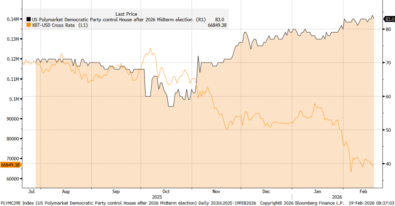 Third, an under-appreciated factor is the shift in the odds of the Democratic Party gaining control of Congress in the upcoming midterm elections. Following an unexpected turn in domestic policy, we have observed a change in the probability complex. Polymarket probabilities – derived from a decentralised prediction market platform where users trade contracts on political and economic outcomes – for a Democratic-led Congress post-midterms are rising, and this trend appears to be mildly negatively correlated with Bitcoin performance.