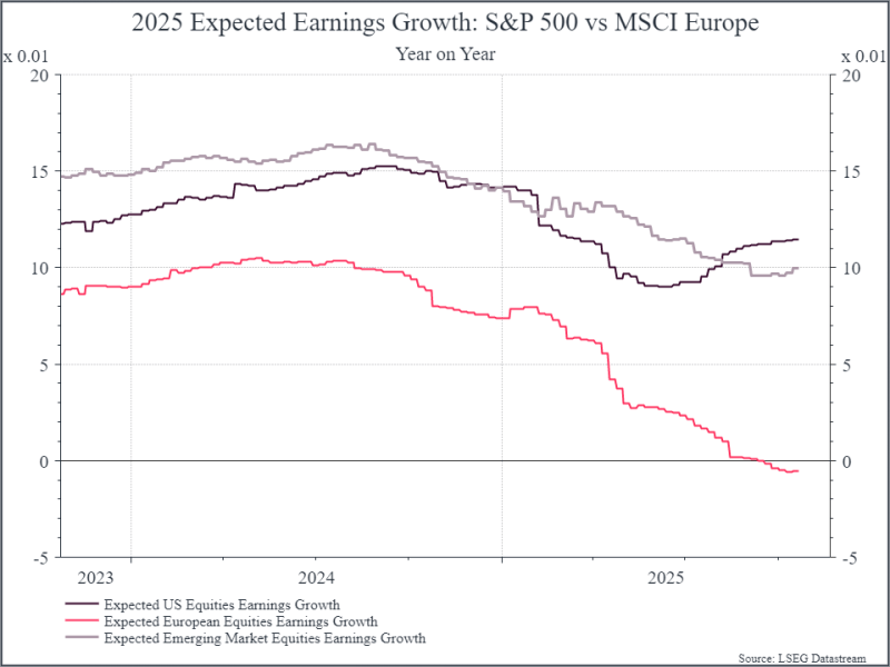 Moving from valuations to current earnings, we can see that EM has held up pretty well. The chart below shows expected 2025 earnings growth for the US, Europe and Emerging Markets and how those expectations have changed over the past eighteen months. As we’ve noted before, expectations for European earnings growth for this year have fallen sharply, while expectations for the US and Emerging Markets have generally held up.