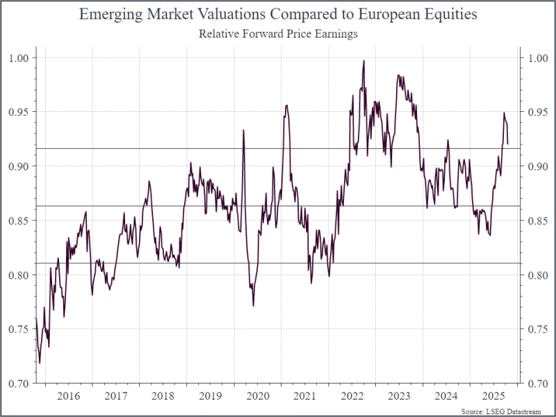 If we compare the valuation of Emerging Market equities to European equities, we see a similar re-rating, but Emerging Market equities are still cheaper than European equities on this metric.