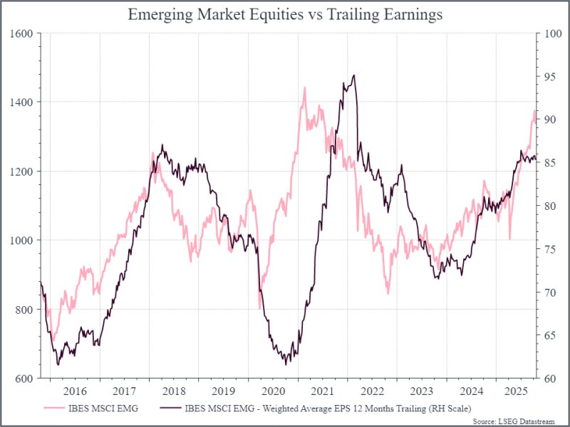 In terms of valuations, Emerging Market equities have seen a pretty sharp re-rating over the past couple of quarters (see chart of the forward Price/Earnings ratio over time, which compares share prices to expected future earnings) as optimism on China and Emerging Market technology companies has risen.
