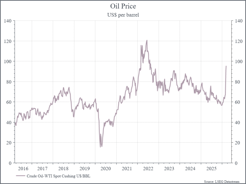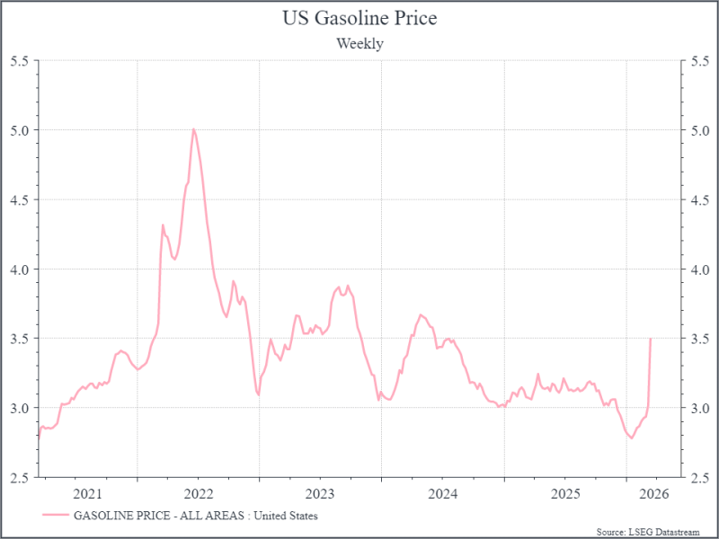 Higher oil prices are already impacting consumers. The chart below shows the price per gallon of gasoline in the US. Again, it’s well below where we were in 2022, but the increase has been notable. The longer gasoline prices stay high, the greater the impact on households in the US and elsewhere. The impact likely won’t be limited just to the price at the petrol pump. Sustainably higher energy prices can impact fertiliser and food prices, as well as the IT supply chain.
