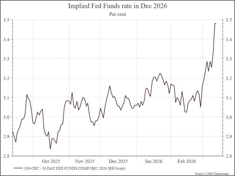 We’ve already seen an impact in bond markets. The chart below shows the implied US policy rate for the end of 2026. At the end of February, investors were looking for two or more rate cuts in the US this year. Two weeks into the conflict, investors think we might be lucky to see one cut. In the UK and Eurozone, there is talk now of rate hikes in 2026.