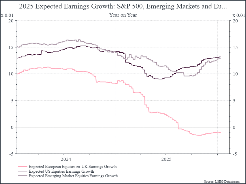 Let’s start by looking back at 2025. The chart below tracks expected earnings growth for 2025 for the US, Emerging Markets and Europe excluding the UK. For the US and Emerging markets, expectations were pretty robust at the start of last year, with analysts expecting double digit growth. Those forecasts came down in the middle of the year, as analysts tried to factor in the impact of the tariff war launched by US President Donald Trump in March.