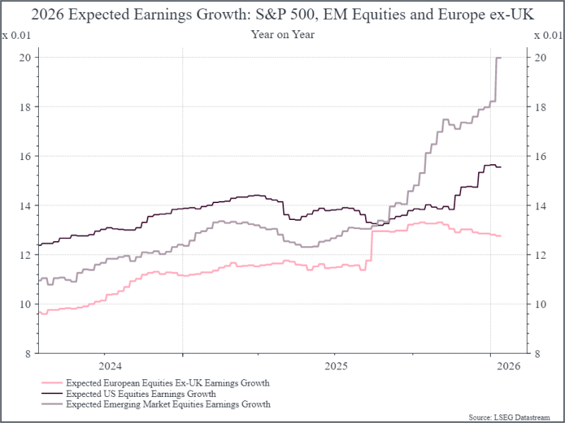 Turning to 2026, the chart below shows the same data but for 2026 earnings forecasts. Again, we are coming into the year with robust earnings expectations – particularly in Emerging Markets. European forecasts are lower again, but analysts are expecting double-digit earnings growth across all three regions, which is a pretty optimistic outlook.