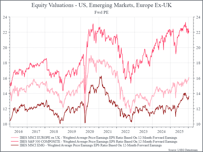Now let’s overlay this with starting valuations, which suggest that investors are taking an optimistic view of the world. The chart below shows the historical forward Price/Earnings ratio for the US, Emerging markets and Europe excluding the UK. As we’ve noted before, valuations in the US are close to their recent peak. Valuations in Emerging Markets and Europe have risen over the past three years, but are below the 2020/2021 peak and remain at a decent discount to the US.