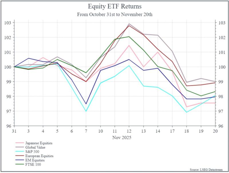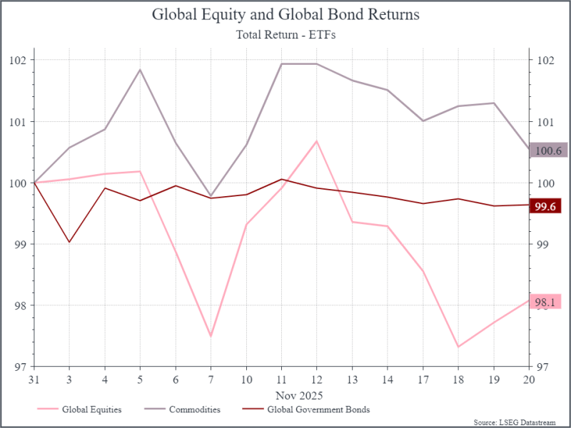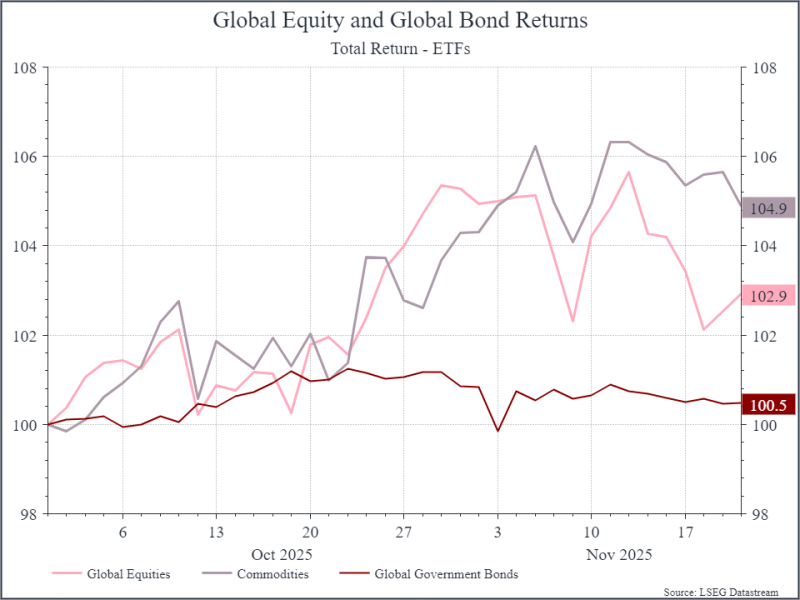 Looking at global market performance from the end of October to 20 November (see chart below), equities have fallen around 2%, commodities have risen slightly, and global government bonds are broadly flat.