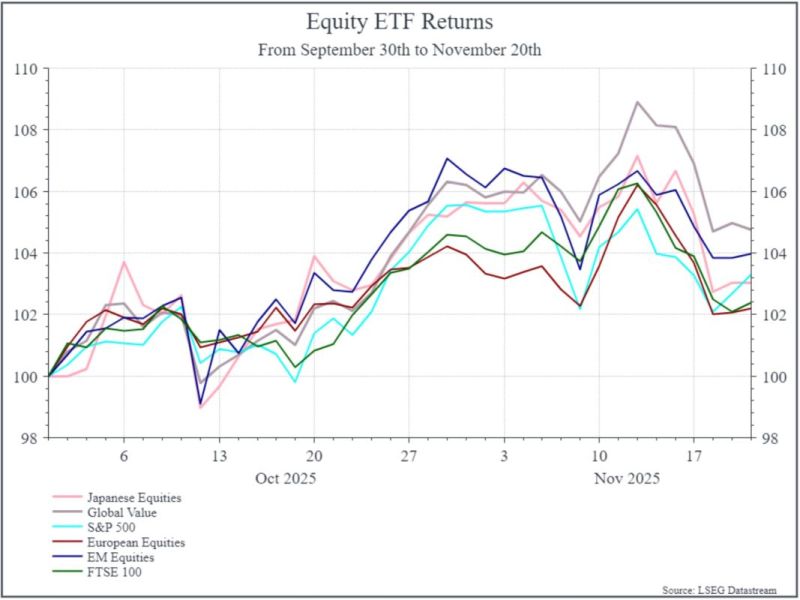 Digging into equity markets a bit further, it’s interesting to see that regional ETFs have generated fairly similar returns (in sterling) since the end of October, despite all the focus on US equities. A global value ETF has fallen around 1% over that period, while Japanese equities are down approximately 2.4%.