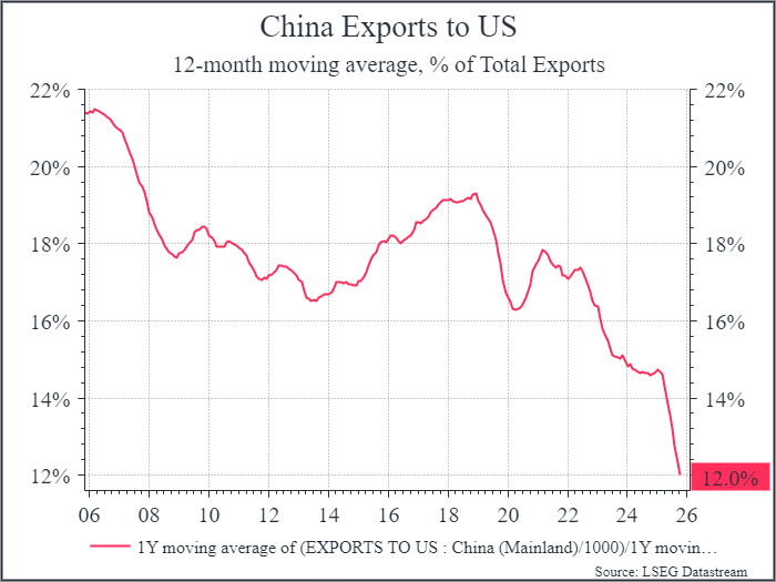 You’d expect that US trade barriers would cause a shift in behaviour, and we’re already seeing that in the numbers. The chart below shows Chinese exports to the US as a percentage of total Chinese exports.