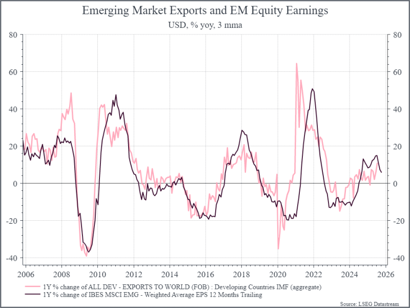 We care about this for a few reasons. First, we generally think that trade should help drive global growth, even if there will be winners and losers below the headline level. Second, we think export growth in Emerging Markets has been correlated with earnings growth for EM equities (see chart below EM export growth vs EM earnings growth), and China is an important part of that. Higher tariffs could stifle export growth in EM going forward, but so far, it seems that EM corporates have held up ok.