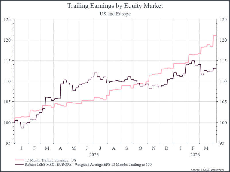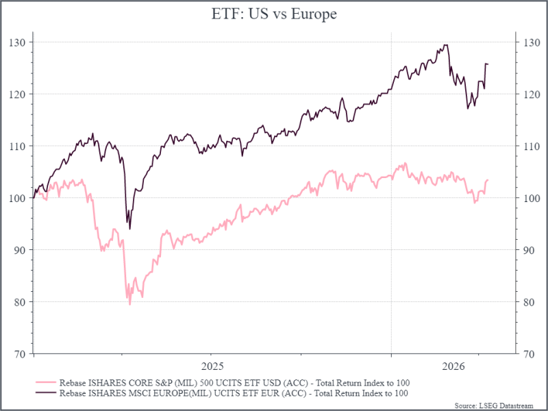 Analysts expect strong earnings growth for both the US and Europe this year, and that might be too optimistic if the global economy slows. In that scenario, US earnings might prove more resilient than those in Europe, as was the case in 2025 – and that, combined with a cheaper relative valuation, might leave US equities looking more attractive as the year progresses.