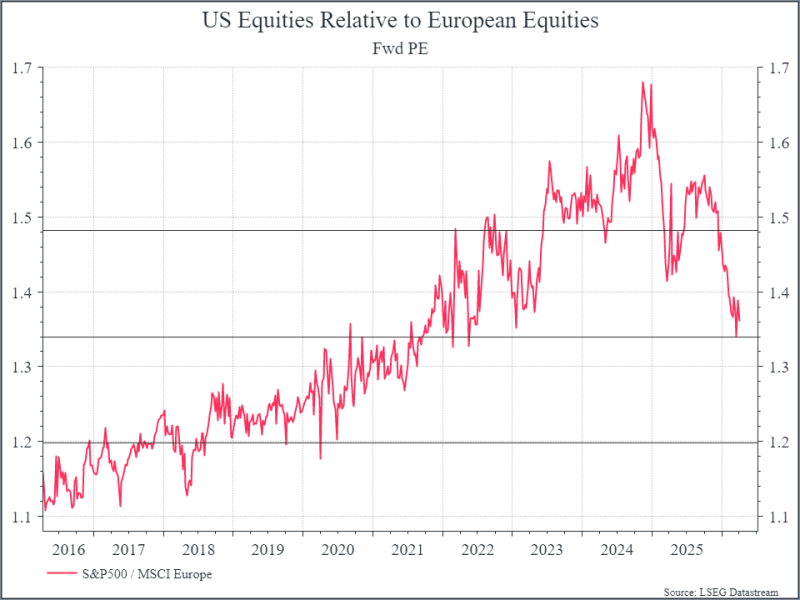 But we think that the shift in valuations is very interesting. The chart below shows the valuation of US equities relative to Europe over the past decade. We saw a steady re-rating of US equities between 2016 and 2024, driven by strong growth and improving profitability, particularly in the tech space.