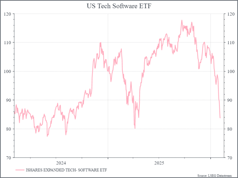Last week Anthropic, the Artificial Intelligence (AI) business, released a range of tools for its Claude Cowork platform that, among other things, can automate legal services. This prompted a sharp sell-off across a range of software businesses (so-called Software-as-a-Service, or SaaS), as investors feared significant potential disruption in those businesses. The chart below shows the progression of an ETF made up of these types of companies.
