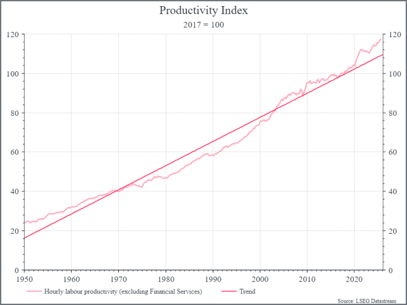 Second, we think it’s important to stay focused on the macro potential of AI – specifically the possibility of sustainably stronger productivity growth. We think there are signs that this is underway. The chart below shows hourly labour productivity over time, along with the long-term trend line. We think the chart shows a couple of distinct periods – first, a period of relative stagnation from the early 1970s to the mid 1990s; second, a pick-up from the early 2000s that seems to be gaining momentum in recent years. If you’re a tech optimist, you’d argue that this second period coincides neatly both with the internet adoption and the incipient AI expansion.
