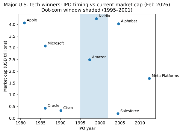 Moreover, we should remember that it’s tough to identify the likely winners and losers in AI. The chart below considers some of the biggest tech companies and looks at when they IPOed. The period of greatest hype didn’t generate the most winners. Of all the companies that listed during the dot-com boom (and there were hundreds), only Amazon and Nvidia have really come to dominate in their categories. And you could argue that Nvidia wasn’t really part of the internet hype. Apple, Microsoft and Oracle predated the internet boom, while Google, Meta and Salesforce came later. The biggest winners from the current AI enthusiasm may not yet have been founded or listed.