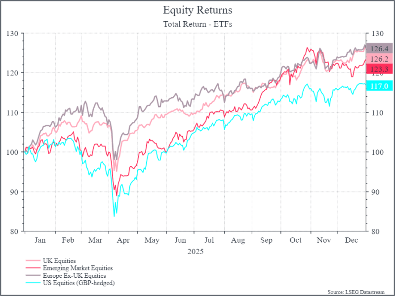 At the same time, the past week raises the question of winners and losers. Will tech effectively eat itself providing both the biggest winners and losers from AI? Does faster global growth argue for greater diversification, as AI investments help their customers become more efficient. As the chart below shows, 2025 saw non-US equities outperform the US (even considering the currency), even as AI dominated the investment debate.