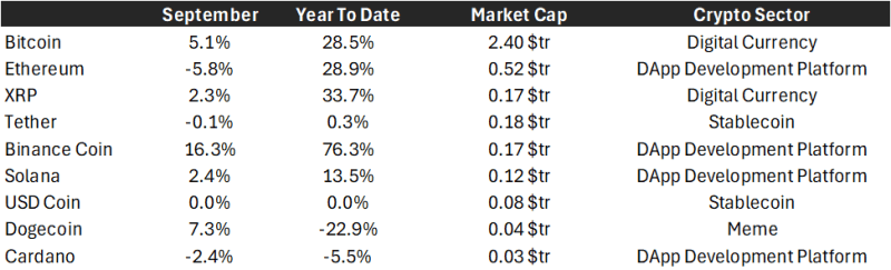 A settembre si è registrata un’inversione di rotta rispetto alla performance divergente osservata ad agosto nel comparto degli asset digitali. Bitcoin ha mostrato una forte resilienza, tornando a guidare il mercato come spesso accade in queste fasi.