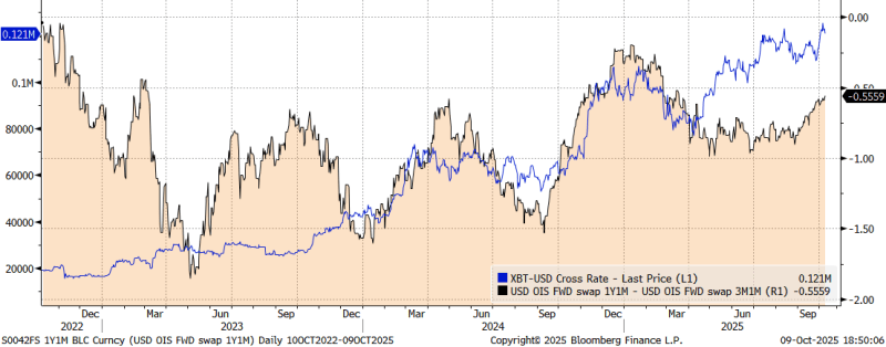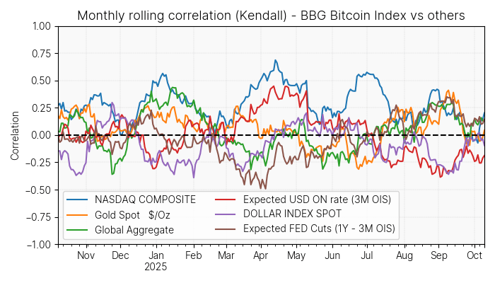 È inoltre persistita una lieve correlazione negativa con le aspettative sui tassi Usa di breve termine – un aspetto importante, dato che Bitcoin tende a salire quando le previsioni sui tassi scendono.