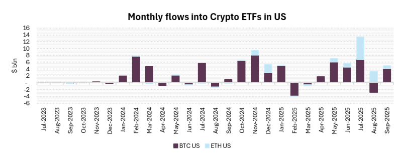 Dopo un periodo di forte domanda, gli afflussi nei prodotti focalizzati su Ethereum (ETH) sono tornati su livelli più normali, come si può vedere nel grafico qui sotto. Nel frattempo, i veicoli di investimento su Bitcoin (BTC) sono rimbalzati, attirando nuovo interesse dopo una performance più debole in agosto.