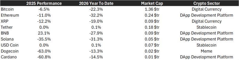 Bitcoin ha inoltre recuperato quota di mercato e sovraperformato Ethereum secondo un riepilogo della performance del 2026. Ethereum, insieme alla maggior parte delle valute legate alle piattaforme DApp – blockchain che supportano applicazioni decentralizzate come smart contract, protocolli DeFi e servizi digitali senza intermediari – e alle meme coin – criptovalute nate spesso come fenomeni virali o comunitari, con valore fortemente influenzato dal sentiment – continua a essere percepito come un asset più speculativo.