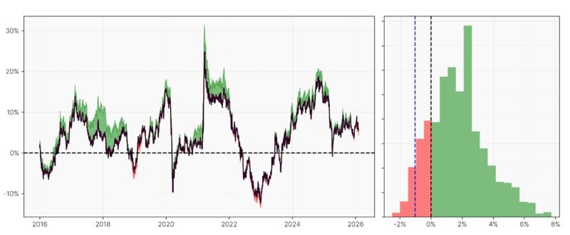 In questo scenario, la gestione del rischio rimane centrale. In Moneyfarm definiamo con attenzione il peso allocato a Bitcoin in portafoglio, con l’obiettivo di contenere l’impatto della volatilità osservata di recente. Il grafico sottostante evidenzia l’effetto marginale sull’andamento di uno dei nostri portafogli multi-asset (linea blu tratteggiata) rispetto alla performance rolling a 12 mesi storica: grazie a una costruzione prudente della posizione, l’impatto complessivo risulta limitato.