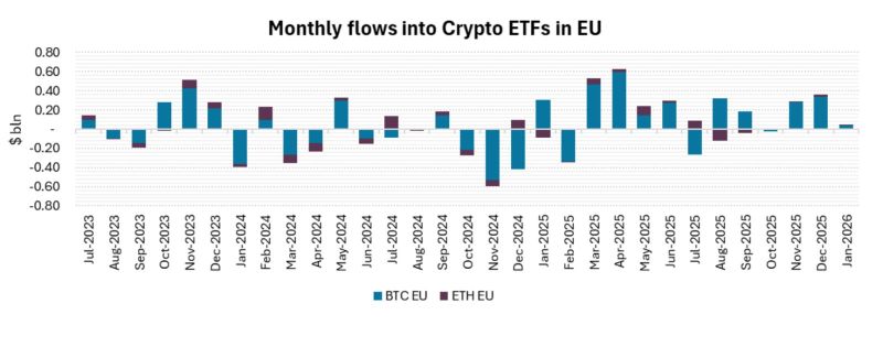 Il mercato europeo resta invece più contenuto. Gli AUM degli ETP su Bitcoin monitorati sono scesi da 9,1 miliardi di dollari a fine dicembre a 8,7 miliardi. Anche correggendo per l’effetto della performance, ciò implica che è proseguita un’attività di acquisto molto marginale anche nel contesto europeo.
