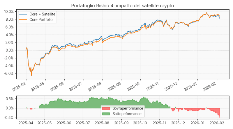 Per un portafoglio Moneyfarm P4, l’impatto cumulato, includendo la performance della giornata del 5 febbraio, si attesta intorno allo 0,5%. Il grafico seguente illustra l’impatto cumulato del satellite sulla performance totale, evidenziando le sue oscillazioni nel tempo.