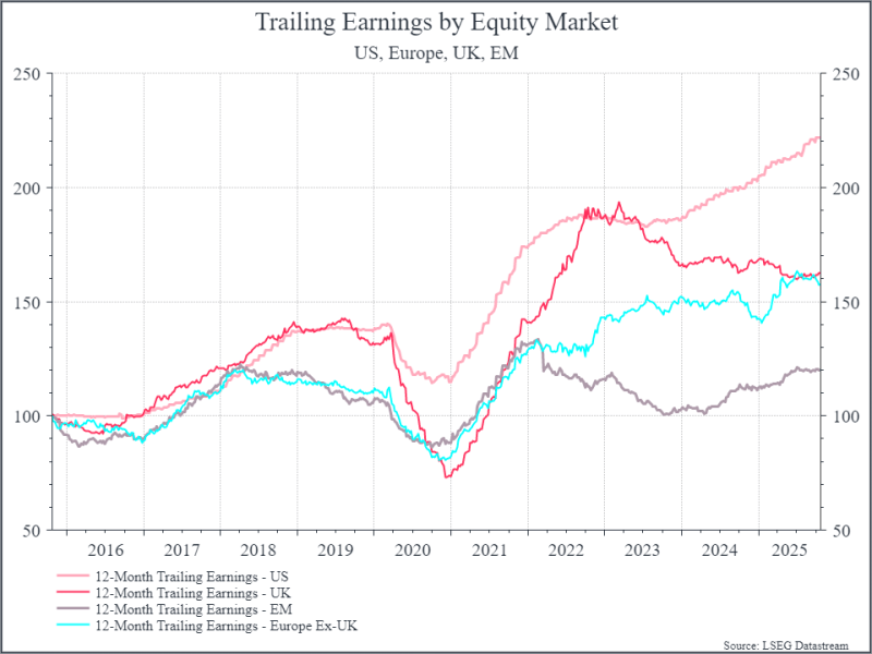Come già osservato in passato, i rendimenti delle società statunitensi hanno costantemente superato quelli del resto del mondo – un fattore che contribuisce a spiegare le valutazioni più elevate riconosciute all’azionario americano. Tuttavia, i mercati emergenti hanno in genere registrato un ROE superiore rispetto all’Europa, e questo rimane vero anche oggi.