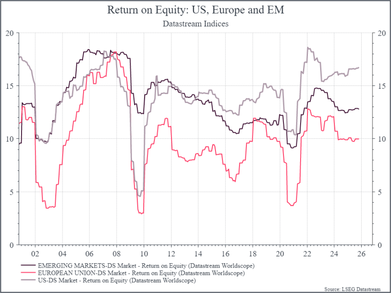 Dal confronto con l’Europa emerge che i mercati emergenti presentano una crescita degli utili più robusta, un ritorno sul capitale più elevato e valutazioni più basse – fattori che riflettono in parte il rischio politico e geopolitico. In linea teorica, tali caratteristiche dovrebbero tradursi in una performance superiore.