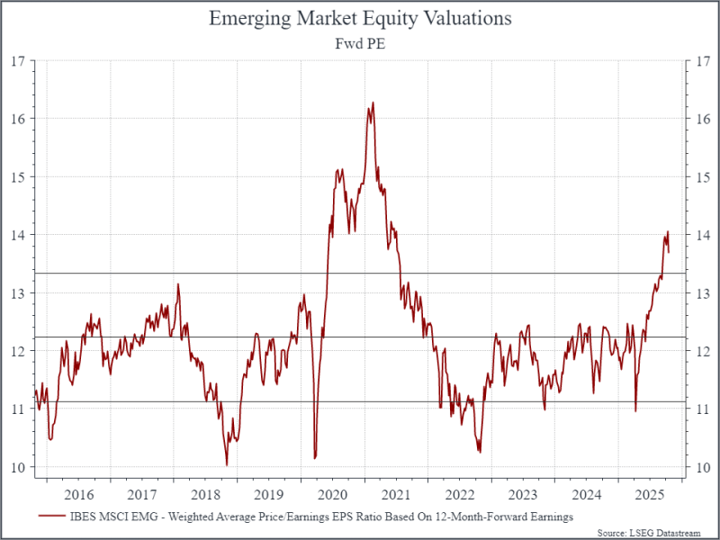 Dal punto di vista delle valutazioni, l’azionario dei mercati emergenti ha registrato una forte rivalutazione negli ultimi trimestri, come mostra il grafico del rapporto prezzo/utili anticipato qui sotto. Questo rapporto confronta il prezzo di mercato con gli utili attesi, fornendo un’indicazione delle aspettative degli investitori. La rivalutazione è stata sostenuta dal crescente ottimismo verso la Cina e le società tecnologiche dell’area.