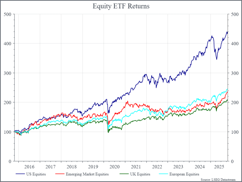Eppure, se guardiamo un po’ più indietro, la realtà appare diversa. Il grafico seguente mostra i rendimenti di diversi ETF azionari negli ultimi dieci anni: i mercati emergenti hanno registrato performance leggermente inferiori a quelle europee, mentre entrambi sono stati nettamente superati dagli Stati Uniti.