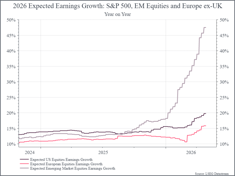 Quindi, cosa sta succedendo? Pensiamo che ci siano diversi fattori in gioco, ma uno dei principali è rappresentato dalla solidità degli utili societari. Il grafico qui sotto mostra le aspettative di crescita degli utili per l’azionario negli Stati Uniti, in Europa e nei Mercati Emergenti nel 2026, e come queste stime siano cambiate nel tempo. Possiamo osservare che, in tutte e tre le aree, la crescita degli utili è solida e ha continuato a migliorare, anche dopo lo scoppio del conflitto in Medio Oriente.