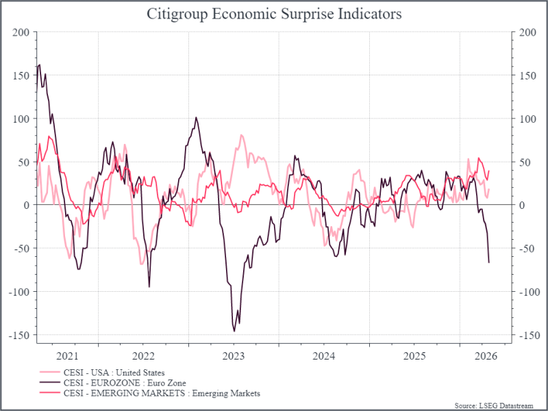 Guardando ai dati macroeconomici, finora negli Stati Uniti si osserva una relativa stabilità. Il grafico qui sotto mostra gli indici di sorpresa economica, che confrontano i dati macro pubblicati con le aspettative degli economisti. Dall’inizio del conflitto, i dati provenienti da Stati Uniti e Mercati Emergenti sono stati in gran parte in linea con le attese, mentre nell’Eurozona si iniziano a registrare numeri più deboli.