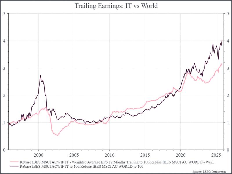 Ma è abbastanza per parlare di bolla? Il grafico qui sotto mette a confronto il settore tecnologico globale con il mercato azionario globale. Questo settore va oltre la sola AI e include molte delle principali big tech quotate negli Stati Uniti. La linea scura mostra la valutazione relativa del tech globale rispetto all’azionario globale, cioè quanto il settore tecnologico è più (o meno) costoso rispetto al resto del mercato. La linea chiara mostra gli utili passati (trailing earnings) delle tech rispetto al resto del mercato.