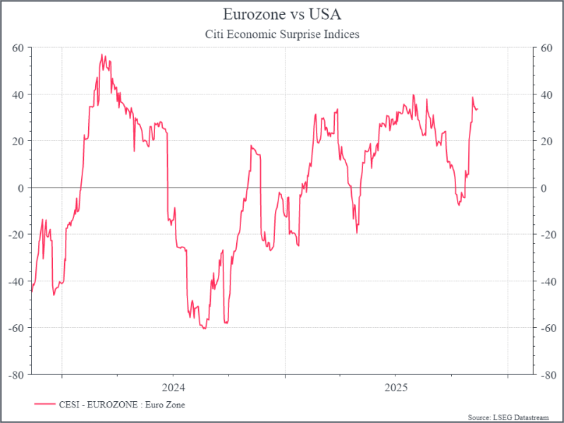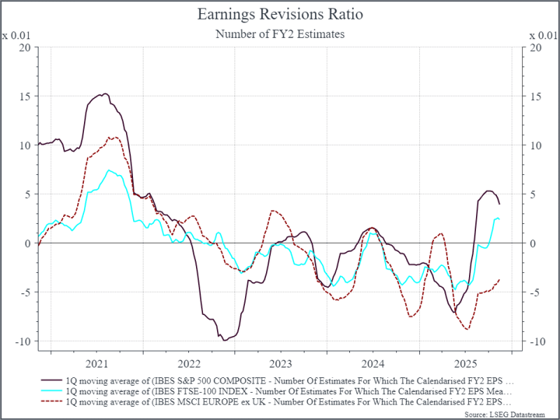 Sul fronte delle revisioni sugli utili, l’Europa continua a mostrare un certo ritardo rispetto agli Stati Uniti, con gli analisti che riducono le stime con maggiore frequenza rispetto a quando le aumentano. Il grafico qui sotto rappresenta l’Earnings Revisions Ratio, cioè il rapporto tra il numero di revisioni al rialzo degli utili attesi (EPS) e il numero di revisioni al ribasso per il secondo anno fiscale. La linea tratteggiata marrone rappresenta l’Europa continentale. Il rapporto sta gradualmente migliorando, e spesso è proprio questa dinamica a essere rilevante per i mercati.