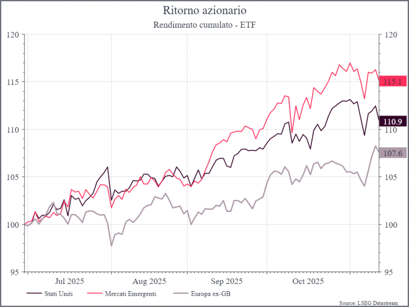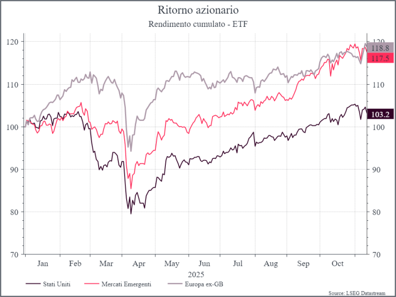 Per Stati Uniti e Mercati Emergenti, le aspettative di crescita degli utili sono rimaste solide, mentre le attese sugli utili europei (escluso il Regno Unito) si sono ridotte in modo significativo nel corso dell’anno. Nel complesso, gli utili del 2025 sembrano destinati a rimanere più o meno stabili rispetto al 2024. In questo contesto, l’azionario europeo ha fatto meglio di quanto ci si sarebbe potuti aspettare.