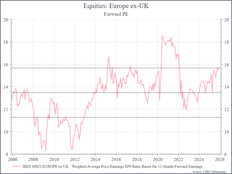 Probabilmente è ancora un po’ presto per attribuire troppo peso alle aspettative di crescita degli utili per il 2026, ma al momento gli analisti si aspettano che le società statunitensi ed europee registrino una crescita degli utili simile (superiore al 7% in entrambi i casi).