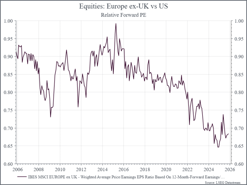 Ma se confrontiamo le valutazioni europee con quelle dell’azionario statunitense, vediamo che il divario resta ampio. Il grafico qui sotto mostra il P/E attesi relativo dell’Europa ex-UK rispetto agli Stati Uniti. È un rapporto che confronta quanto è “caro” l’azionario europeo rispetto a quello statunitense, sulla base degli utili attesi nei prossimi 12 mesi.